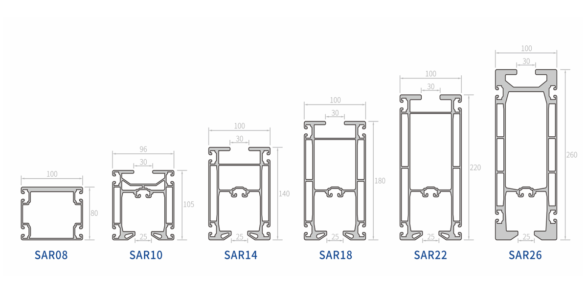 | SAR08 | Aluminium, anodiseret | 4,1 kg/m | 152cm^4/202cm^4 | 30cm^3/40cm^3 |