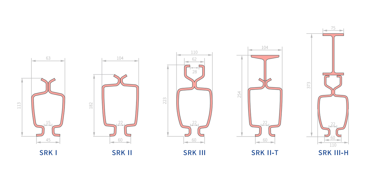 | SRK II-T | Højstyrke blødt stål | 26,6 kg/m | 33,88 cm² | 2380 cm⁴ | Ikke udstyret med faste skinner | Følgende graf | Brugerdefineret størrelse | RAL2002 |
