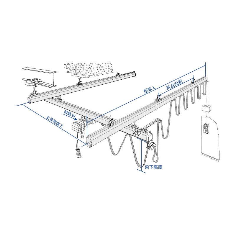 · Strukturel type og driftskontrolmetode: Den strukturelle type refererer til fritstående (fundamenttykkelse) eller ophængt type. Hovedbjælkerne kan være enkelt-, dobbelt- eller teleskopiske, såvel som det nødvendige antal og belastning. Driftsmetoder omfatter manuel, fuld elektrisk eller elektrisk betjening af vognen og vognen. Strømforsyningsmetoder omfatter fladt kabel, samleskinne eller C-skinne. Kontrolmetoder omfatter håndtagskontrol og fjernbetjening.